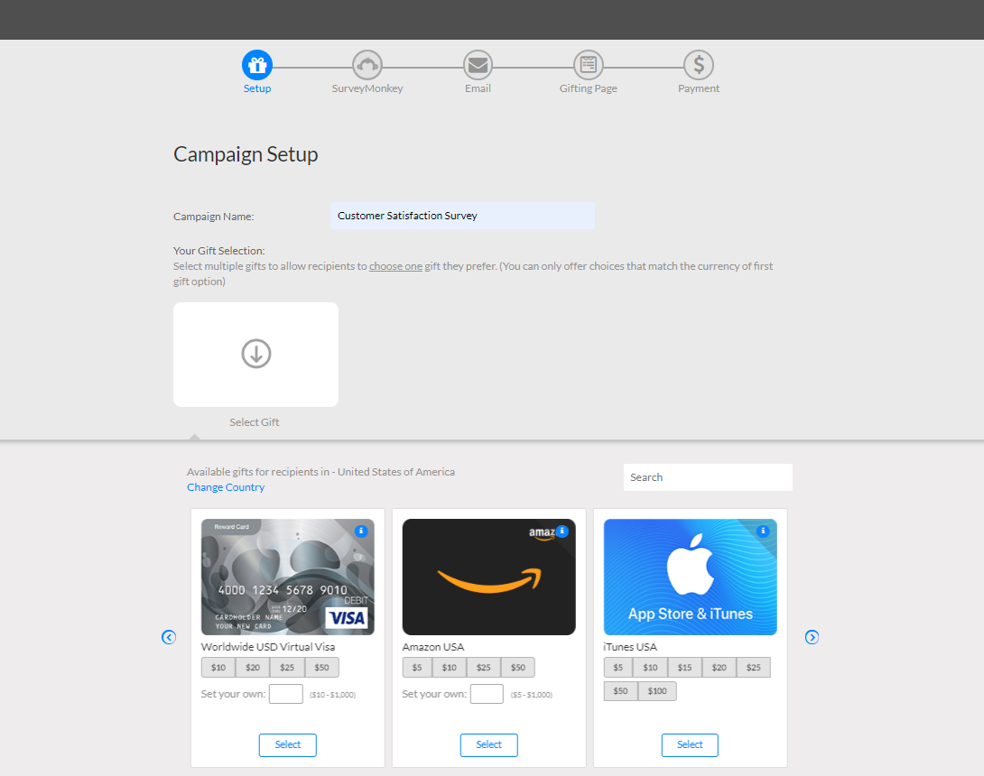 SurveyMonkey rewards options include gift cards from top retailers like Amazon.com as well as a Virtual Visa prepaid card that works in over 150 countries and is a great fit for international surveys.